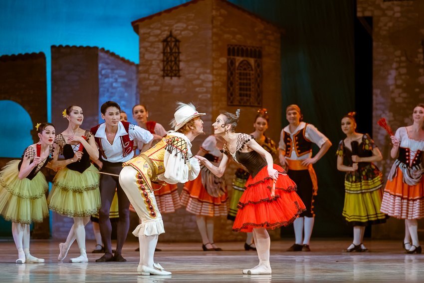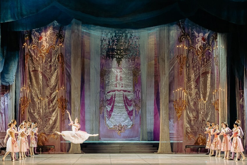 Анализ освещения в примере: сцена равномерно залита светом, что создает яркую и насыщенную атмосферу. Однако декорации фона все же притемнены примерно на 0,5-1 EV, что позволяет сосредоточить внимание зрителя на солисте и кордебалете.