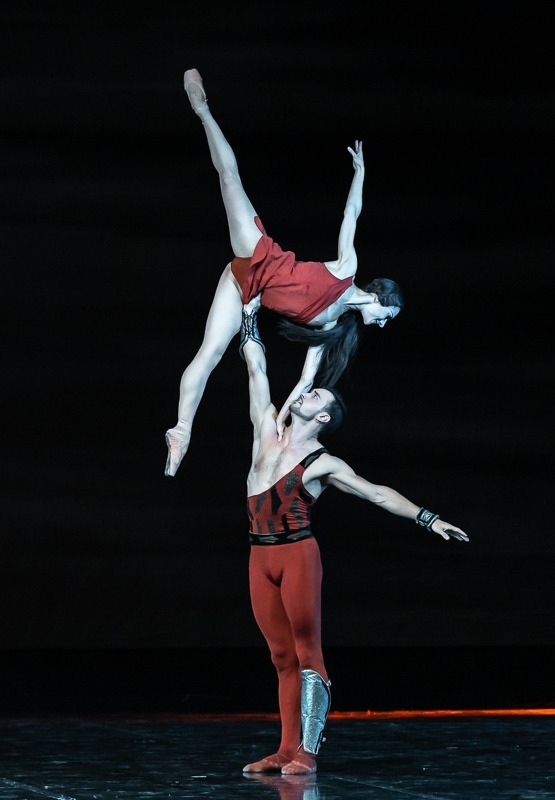 В этой сцене все движения плавные, поскольку исполняется адажио. Нет необходимости сильно укорачивать выдержку, значение 1/200 с. достаточно для получения четкого снимка без смазывания. Диафрагма широко открыта, так как задний фон сцены не требует резкости ввиду недостаточной освещенности да и отсутствия какой-либюо значащей информацц на нем. Высокая отрицательная поправка экспозиции вызвана значительным уровнем контрастности сцены и обширной темной областью в кадре.