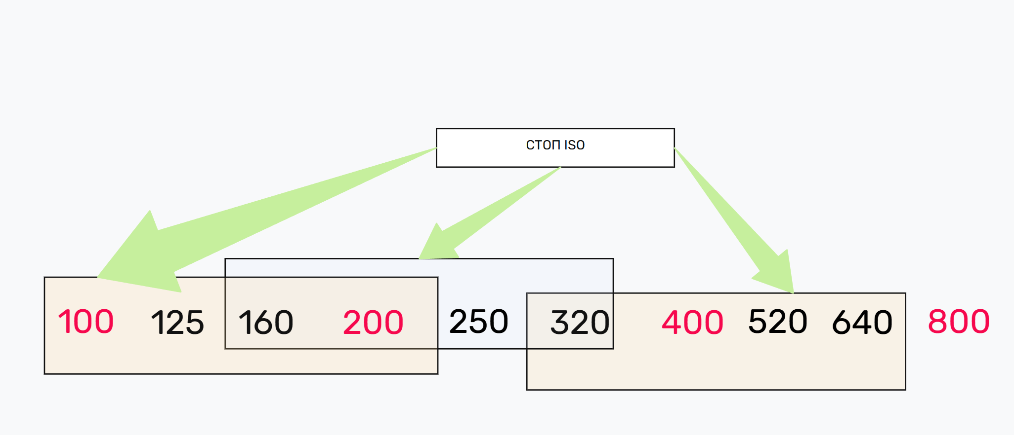 Выпишем несколько значений стандартного ряда ISO: 100, 200, 400, 800, 1600, 3200, 6400, 12800 и тд